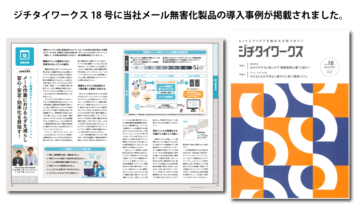 情報セキュリティ対策の対応とメール作業の負担を軽くするなど、一連の課題を解決しているという真相は「ジチタイワークスvol.18」にて掲載されました